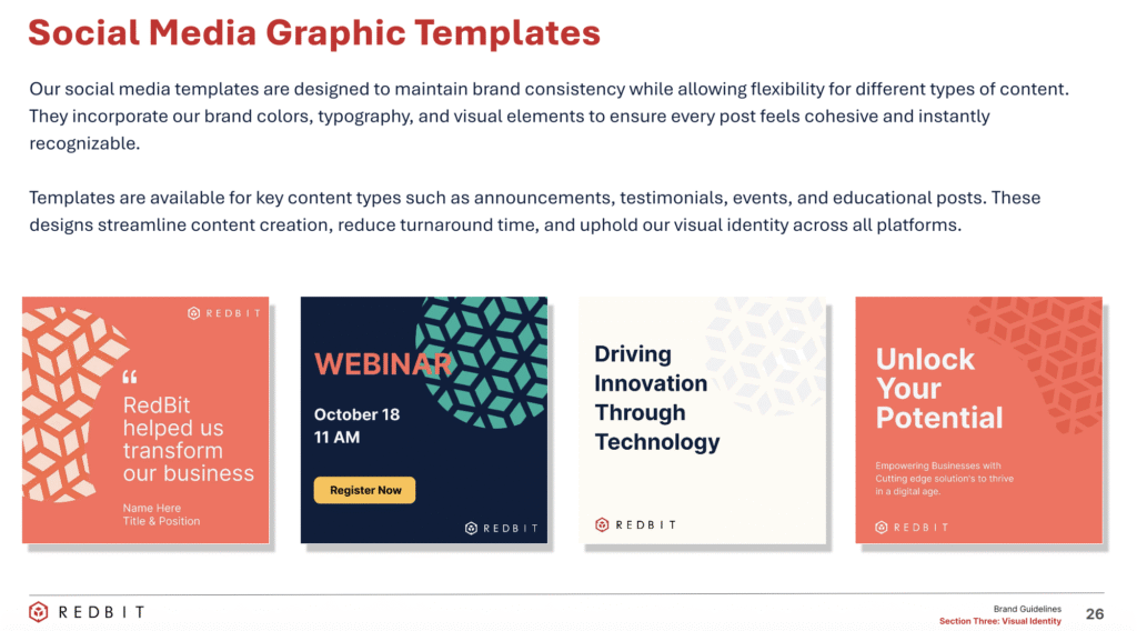 Different teams described the company in different ways, and without a clear foundation, their brand voice felt fragmented. Their visuals and tone were outdated, their templates inconsistent, and their marketing collateral no longer reflected the innovative energy of the people behind the work. RedBit needed a cohesive brand strategy that captured who they were and where they were headed.
