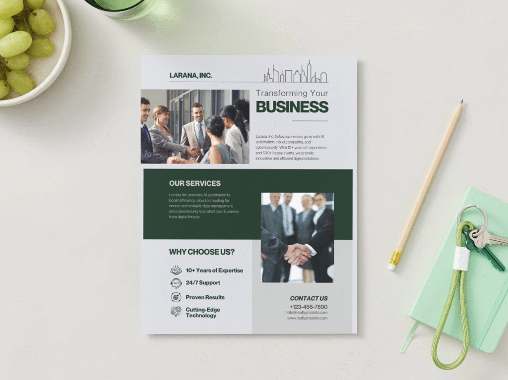 Strategic layout, clean hierarchy, and striking visuals come together to communicate your value in seconds. Easy to print, easy to share, and always on-brand, these pieces help your story land with impact wherever they’re displayed.