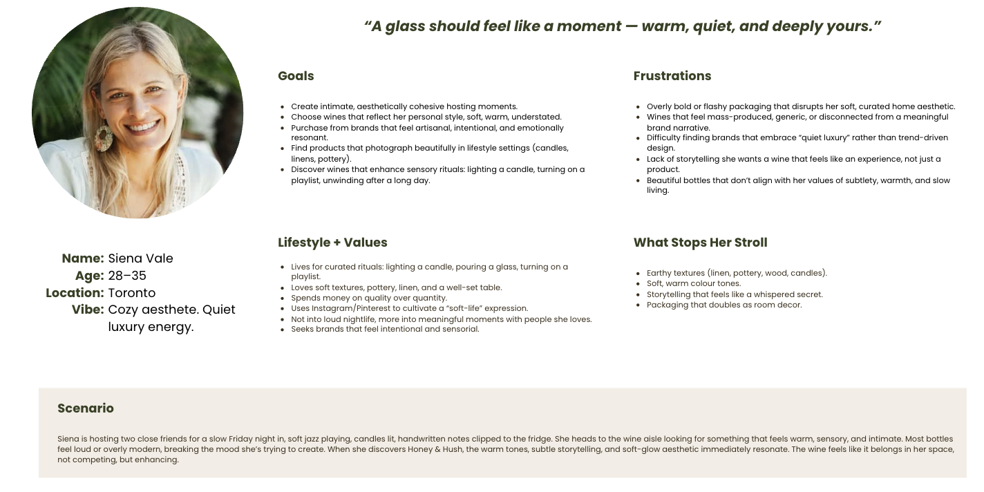 Initially, I assumed that consumers primarily sought elegant packaging paired with high-quality wine as the baseline expectation. However, the research revealed a far more sensorial and ritual-oriented audience. Users like Siena—a representation of the “Intimate Host” persona—were not simply purchasing wine; they were curating moments. They valued atmosphere, textures, candlelit rituals, slow evenings, and products that contributed to a cohesive aesthetic throughout their home.